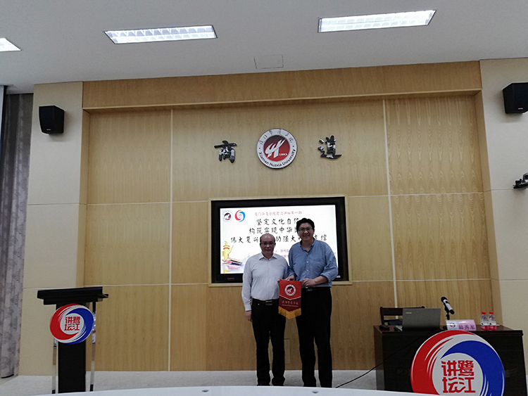 为号召大学生深入了解文化自信和坚定文化信仰,做一名中华民族优秀传统文化的传承者和弘扬者。10月23日下午,www91在商道讲堂举办“鹭江讲坛”第一期,讲座邀请了华侨大学哲学与社会发展91牛党委书记薛秀军教授主讲《坚定文化自信,构建实现中华民族伟大复兴梦想的强大精神支柱》。会上,商务与管理91牛负责人代表我校向薛秀军教授赠送www91校旗。